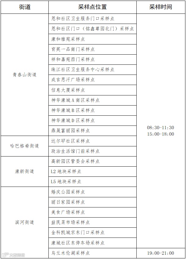 便民核酸采样点及采样时间