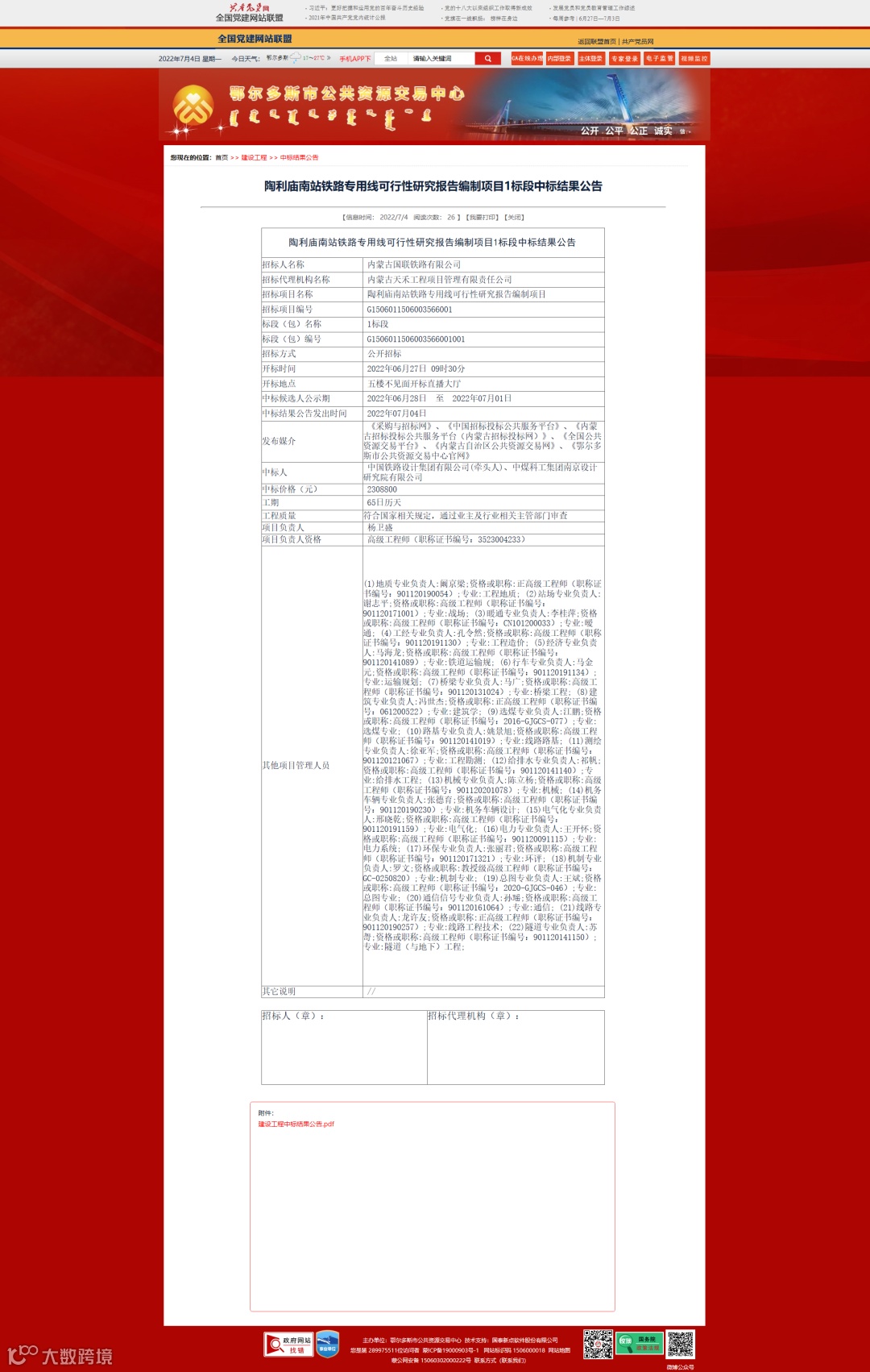 7月4日,国联公司陶利庙南站铁路专用线项目可行性研究报告编制标段于鄂尔多斯市公共资源交易中心官网发布了中标单位公示信息。中标单位为中国铁路设计集团有限公司与中煤科工集团南京设计研究院有限公司组成的联合体投标单位,中标价为230.88万元,可研编制期限为65日历天。