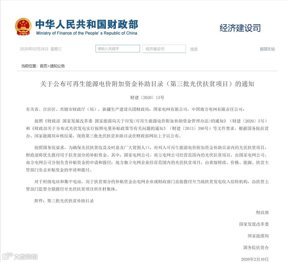 2月25日,国家财政部官网公布了国家第三批光伏扶贫补贴目录,能源公司3MW赛台扶贫光伏电站名列其中,财政部将优先拨付用于扶贫部分的补贴资金,预计3MW光伏扶贫项目可申报补贴金额为99万元,将为公司扶贫收益及时发放提供有力保障。