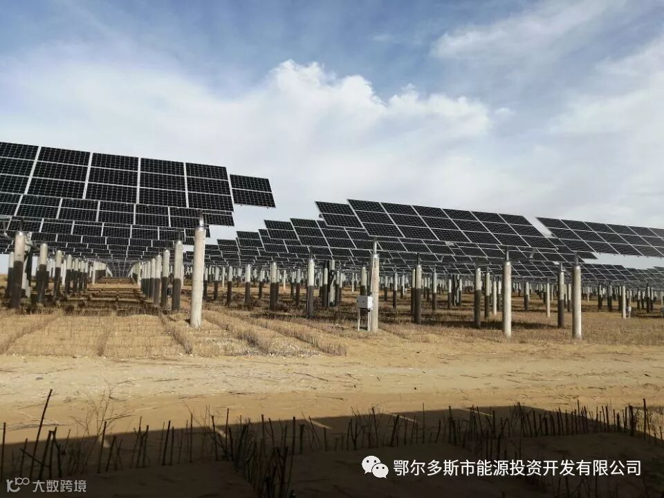 达拉特旗光伏领跑基地是国家能源局优选确定的全区唯一的应用领跑示范基地,项目位于鄂尔多斯市达拉特旗昭君镇库布齐沙漠腹地,国电投领跑基地项目装机容量300MW,并于2018年12月实现并网发电;光伏组件采用单晶硅双面双玻组件,光伏支架形式采用高支架、手动可调固定支架、斜单轴和平单轴智能跟踪系统,有效地提升了发电效率。电站采用“农光互补”模式,发展“光伏+治沙+农林+旅游”,推进沙漠生态治理、可再生能源发电产业、沙漠农林结合、沙漠特色旅游等多产业融合发展的新思路。