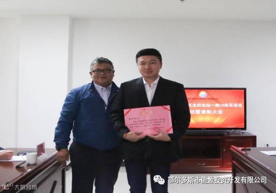杭锦旗20兆瓦光伏电站一期10兆瓦项目是能源公司贯彻落实我市“十三五”新能源发展规划的重点工程之一,也是探索开发清洁能源领域迈出的第一步。会议主要围绕杭锦旗20兆瓦光伏电站一期10兆瓦项目开展过程中所遇到的问题、取得的成绩以及收获的经验等内容进行了总结并对下一步工作的开展进行了部署。会上,总工程师王建斌对项目背景、建设情况及电站运营等基本情况进行了详细的介绍,各部门负责人针对项目建设期工作做总结汇报,副总经理杨光荣宣读了关于表彰项目建设期先进个人的决定,并由董事长杜强亲自颁发荣誉证书。
