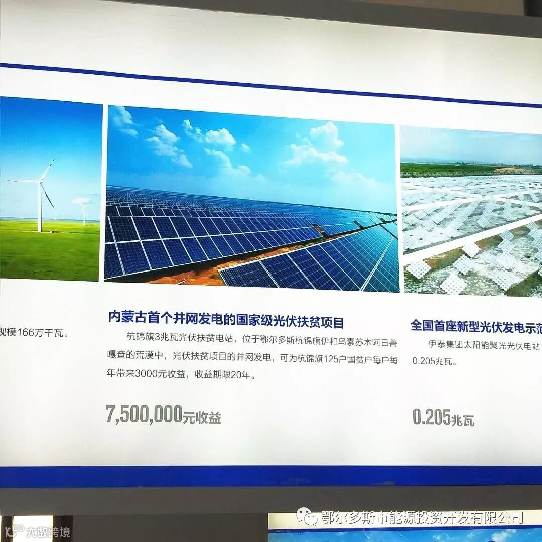 大会以“探索新时代内蒙古能源发展路径”为主题,分为“煤炭”“煤化工”“石油天然气”“电力”“新能源”5大板块向来宾展示了内蒙古近年来取得的成绩和发展现代能源经济的思路和计划。截至2018年8月初,鄂尔多斯在新能源领域装机容量达188.92万千瓦,其中光伏发电79.12万千瓦、风电30万千瓦、水电75万千瓦、生物质装机4.8万千瓦,我市在新能源开发利用领域取得了优异的成绩。能源公司作为我市唯一致力于新能源投资建设的地方国有企业,投资建设的杭锦旗3MW光伏扶贫电站项目作为2018年内蒙古首个并网发电的国家级光伏扶贫项目在新能源板块展出,公司也作为样板企业同央企、大型上市公司等能源领域知名企业一同进行推广,进一步提塑了企业形象。
