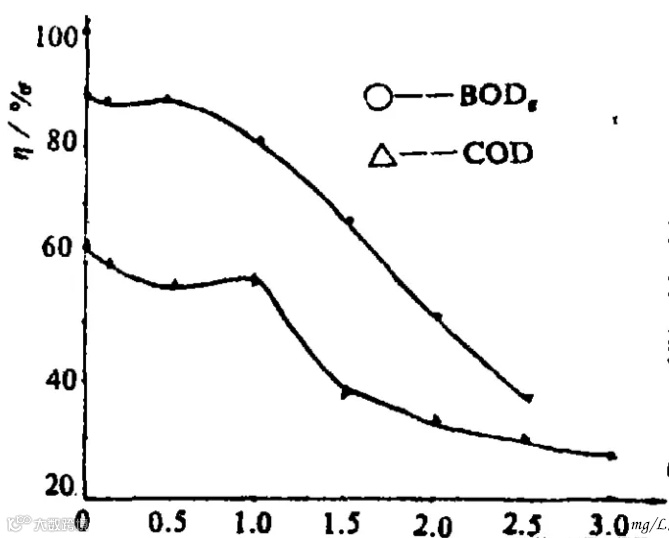 当余氯剂量从0.1mg/L逐渐增加到 3.0mg/L, 废水pH值控制在7.5左右 , 余氯剂量达到1.0 mg/L 时 ,COD与BOD去除率开始下降;当毒剂量达到1.5mg/L时 , 原生动物的数量和形态没有显著的变化 , COD和BOD去除率分别降至39%和69% ; 毒剂量超过2.5mg/L时 , COD去除率降至30%以下 , 活性污泥絮凝体出现解体,原生动物大量死亡 。
