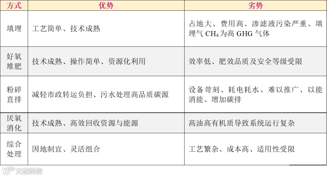 厌氧消化与其他4种处置方式相比,在资源回收和碳减排方面具有突出优势,这就决定了厌氧消化产沼气为今后餐厨垃圾处置中的首选方式。