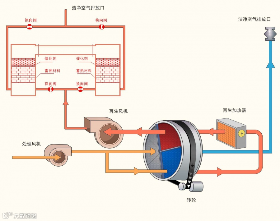 原理是把有机废气加热到760℃以上,使废气中的VOC在氧化分解成二氧化碳和水。氧化产生的高温气体流经特制的陶瓷蓄热体,使陶瓷体升温而“蓄热”,此“蓄热”用于预热后续进入的有机废气。从而节省废气升温的燃料消耗。陶瓷蓄热体应分成两个(含两个)以上的区或室,每个蓄热室依次经历蓄热-放热-清扫等程序,周而复始,连续工作。蓄热室“放热”后应立即引入部分已处理合格的洁净排气对该蓄热室进行清扫(以保证VOC去除率在95%以上),只有待清扫完成后才能进入“蓄热”程序。