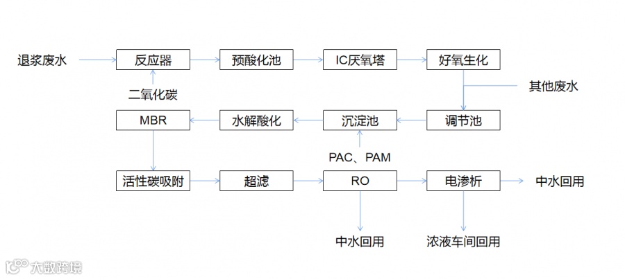 在深入研究印染废水特性之基础上,本如图2的处理工艺可以实现印染车间生产废水零排放的污水处理工艺,主要工艺单元有沉淀、预酸化、IC厌氧、好氧曝气、MBR、活性碳吸附、超滤、RO、电渗析等。工艺流程图-2所示: