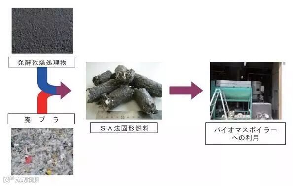 污泥经过45天发酵干燥处理后与废旧塑料混合形成固体燃料的技术。目前该技术已在福井县应用。