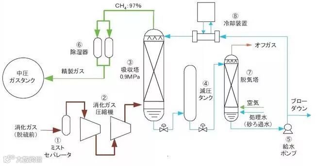 消化气体在在0.9 Mpa左右的中压环境下和循环水接触,消化气体中硫化氢被水吸收,形成纯度97%以上的甲烷气体,可作为城市天然气使用。该项技术在神户和上田等地已经建设投入使用。