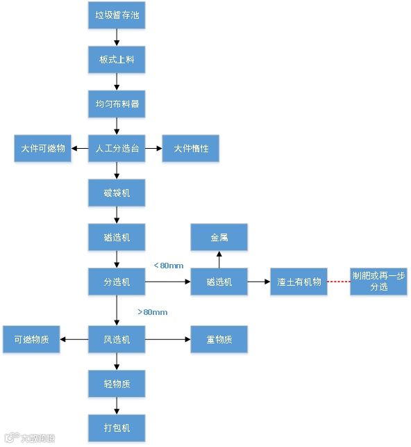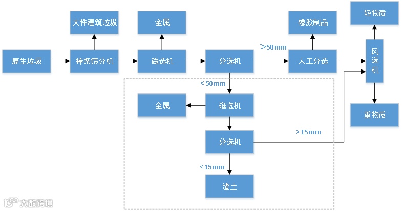 原生垃圾通过铲车上料进入棒条筛分机进行预筛分把大件建筑垃圾分选出来,筛下物通过皮带输送机输送经跨带式磁选机选出金属,经过磁选的物料经分选机进行分级,大于50mm的物料经人工分选平台选出橡胶制品等,经过人工分选的物料经皮带机输送到风选机进行风选,选出轻物质和重物质,小于50mm的物料经皮带机输送到磁选机选出金属,磁选后的物料输送到分选机进行二级分级,筛下为渣土可以做培植土使用,筛下物进风选机分为轻物质和重物质,轻物质打包外运。此工艺可根据现场垃圾成分及后续工艺做下调整。