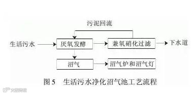 新型生活污水厌氧净化池(或称城镇生活污水净化沼气池)是一种小型分散化污水处理装置。生活污水净化沼气池是在化粪池和沼气池的基础上发展起来的,解决了化粪池处理效果差、沉积污泥多、沼气池沼气回收率低的弊端,其工艺流程见图5。