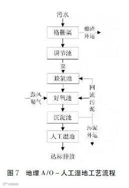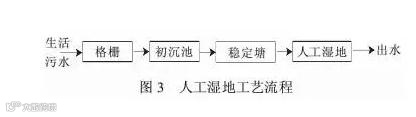 是利用人工水生态系统内多级生物的稀释降解作用来去除或削减水中污染物的方法。人工湿地作为一种新型生态污水处理技术具有投资和运行费用低、抗冲击负荷能力强、处理效果稳定、出水水质好、水生植物有一定经济价值等诸多优点。用于农村生活污水处理的主要是潜流人工湿地。人工湿地处理工艺流程图见图3。