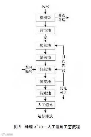 A2/O工艺亦称A-A-O工艺,本工艺为采用厌氧—缺氧—好氧法生物脱氮除磷工艺的简称,是流程最简单,应用最广泛的脱氮除磷工艺。适用于处理要求较高,四季气候变化大,气温较低的地区。处理规模不小于200吨/天。工艺参数:厌氧池停留时间不小于2h,缺氧池停留时间不小于4h,好氧池停留时间不小于6h,人工湿地水力负荷0.5~1.0m3/(m2˙d),污泥理周期180天,工艺流程见图9。