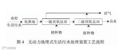 工艺流程为分离池-腐化池-酸化池-氧化池-排放。该工艺无动力、低能耗、占地面积小、出水水质好。但是化粪池存在清掏困难、产生恶臭气体和堵塞管道等缺点。