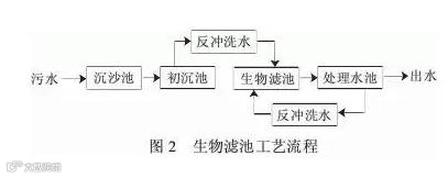 其最大的特点是集生物氧化和截留悬浮固体于一体,节省了后续沉淀池,厌氧水解—高负荷生物滤池处理系统集初沉池、曝气池、污泥回流设施以及供氧设施等于一身,大大简化了污水处理流程。生物滤池工艺流程见图2。