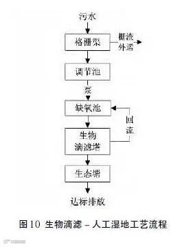 本技术适用于处理要求一般,规模较小,距离居民区较远的污水处理设施,处理规模10~30吨/天。工艺参数:集水池停留时间不小于12h,缺氧池停留时间不小于12h,生物滤塔负荷0.2~0.3m³/(㎡˙d),人工湿地水力负荷0.5~1.0/(m2˙d),污泥理周期180天,工艺流程见图10。