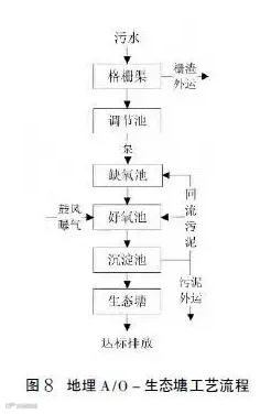 该技术适用于拥有自然池塘或闲置沟渠,地势条件易于收集污水,并能通过自流出水的且规模适中的村庄,处理规模20~200t/天。工艺参数:缺氧池停留时间不小于4h,好氧池停留时间不小于6h,生态塘停留时间不小于24h,污泥清理周期180天,工艺流程见图8。