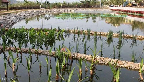一种常规生化处理后增加生态塘处理工艺。生态塘亦称氧化塘或稳定塘,是一种利用天然净化能力对污水进行处理的构筑物的总称。其净化过程与自然水体的自净过程相似,通常是将土地进行适当的人工修整,建成池塘,并设置围堤和防渗层,依靠塘内生长的微生物来处理污水。
