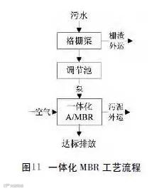 一种将活性污泥法和一体化浸没式膜分离系统结合的传统改良型工艺,利用膜组件进行的固液分离过程取代了传统的沉降过程,能有效的去除固体悬浮颗粒和有机颗粒,制备无菌水。系统出水可直接用于生产或生活回用。废水通过本处理系统处理排放出水的各项指标均可以达到《城市污水再生利用城市杂用水水质》的指定标准。该技术适用于有回用要求或用地紧张的的污水处理设施,处理规模20~500吨/天。工艺参数:缺氧反应区停留时间不小于2h,MBR区停留时间不小于4h,污泥理周期360天,工艺流程见图11。