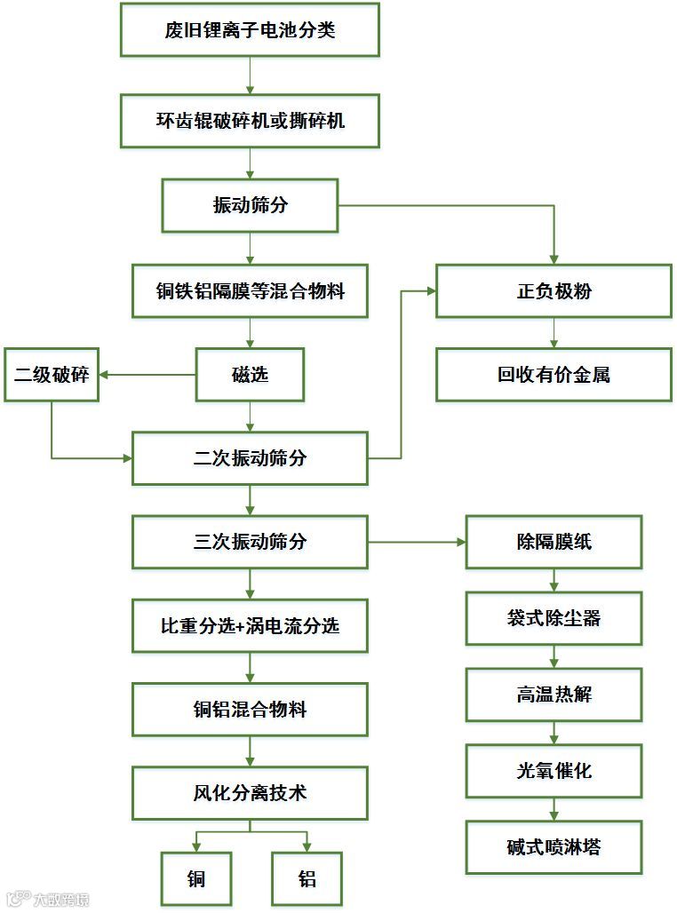 此工艺可从废旧锂离子电池中分离出铜、铝、正负极粉、铁、隔膜纸和有价金属。具体工艺实施方案为:废旧锂离子电池首先用具有超强破碎能力的环齿辊破碎机将大尺寸的钢壳废旧锂离子电池破碎成大块混合物料,或用撕碎机将软包电池撕碎;之后经振动筛,通过不同目径的筛网分别获得三类物料(铜铝等混合物料、铁壳、正负极粉);再经干式永磁筒式磁选机去除混合物料中的铁磁性物质;剩余混合物料经过二次破碎将粘结于铜铝集流体的材料进一步分离,送入直线振动筛或复频筛、联合袋式除尘器,可去除混合物料中的隔膜纸与正极粉,再经涡电流分选机、比重分选机分选最终获得品位较高的铜铝混合料;通过高温风化技术将铜铝混合物料中铜铝分开。