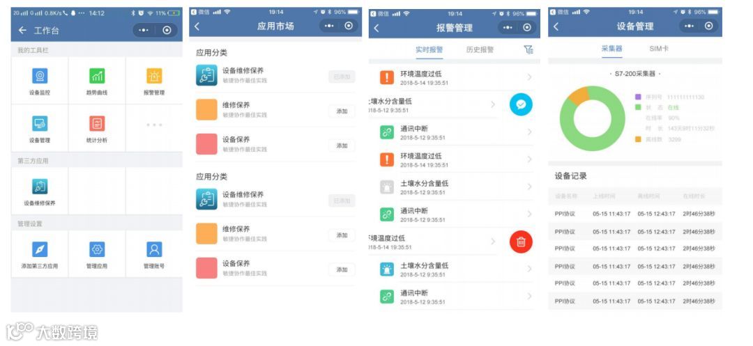 本平台支持通过微信公众号或者微信小程序对设备的运行状态、报警信息等进行监控管理,同时可以接入第三方应用程序。