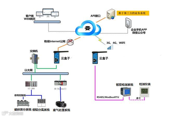 采用物联网云盒子+西门子PLC+智能检测+人机交互平台,它集成多种互联网通讯技术、面向工业领域的设备通讯终端产品。集GPRS 、4G、以太网、协议解析等技术于一体。