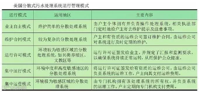 为强化分散式污水处理系统的运行管理,根据环境的敏感性和处理规模,美国环保局提出了5种管理程度逐步加强的运行模式。同时,美国政府出台一系列配套政策如社区污水系统综合管理计划,用以提供资金支持分散污水系统的长期维护,从而有效保障了分散式污水处理系统的有效运行。