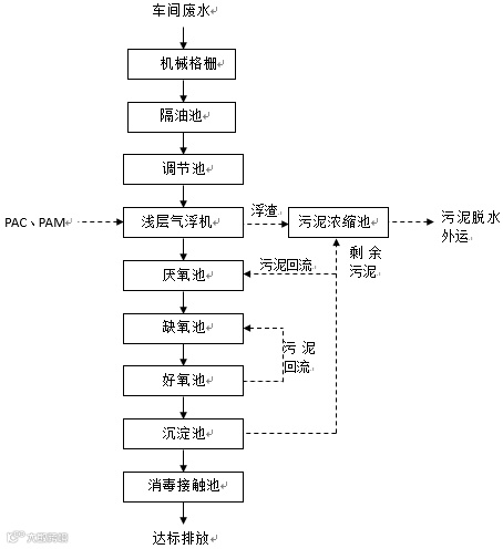 根据车间废水水质特点,本项目采用“隔油+浅层气浮+A2/O脱氮除磷生物氧化+二氧化氯消毒”的处理工艺。