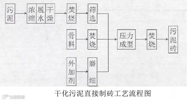 污泥制砖是指将污泥经过一定处理筛选后,与其他原料或外加剂混合(如黏土、页岩、煤研石、粉煤灰),加压成型,焙烧后制得污泥砖。该方法不仅在坯料中封存污泥中的有毒重金属,杀死有害病菌,实现污泥资源化;同时充分利用污泥热值,制成的污泥砖空隙多、砖质轻,具有一定的隔音隔热的效果,而且完全没有异味。经过条件优化,污泥砖的主要指标可达到普通烧结砖的国家标准,具有高抗压强度、重量比同体积的普通砖轻等优点,可节省10%的能耗,10%-15%的黏土土资源。常见的污泥制砖有两种方法,分别为污泥焚烧灰制砖和干化污泥直接制砖,目前市场上以干化污泥直接制砖为主,其工艺主要是通过人工烘干或自然晾干将污泥干化后进行磨细处理,之后和其他原料混合加压成型烧制成砖,污泥制砖主要技术要点是控制污泥掺量(10%-20%),当污泥掺量高于30%时,污泥砖抗压强度己不能达到砖的性能标准。