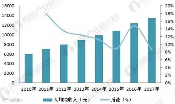 经济的快速发展带来了国民收入水平的持续提升。数据显示,2010年农村居民人均存收入仅为5919元,至2017年已经实现了翻倍,达到13432元,同比增长8.65%。2010-2017年复合增长率达12.42%。