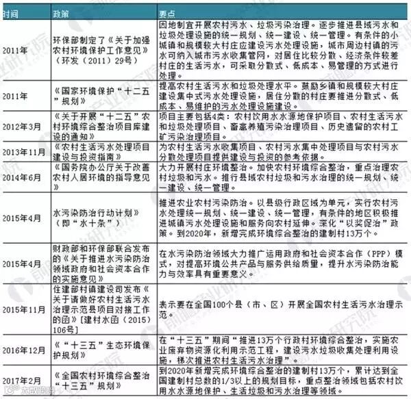 2017年2月,环保部、财政部联合印发的《全国农村环境综合整治“十三五”规划》也提出,到2020年新增完成环境综合整治的建制村13万个,累计达到全国建制村总数的1/3以上的规划目标,重点整治领域包括农村饮用水水源地保护、生活垃圾和污水治理等领域。