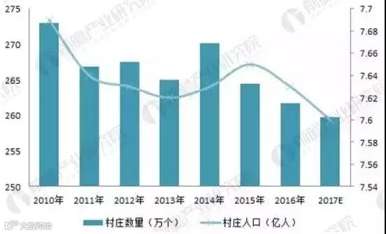 图表1:2010-2017年中国村庄数量及人口变化趋势(单位:万个,亿人)