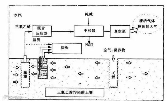 生物通气法是将氧气流导入不饱和土层中,增强土著细菌的活性,促进土壤中有机污染物的自然降解。生物通气主要促进燃油污染物的降解,也可以通过土壤的生物活化作用促使挥发性有机物以蒸气的形式缓慢挥发,工艺如图示。