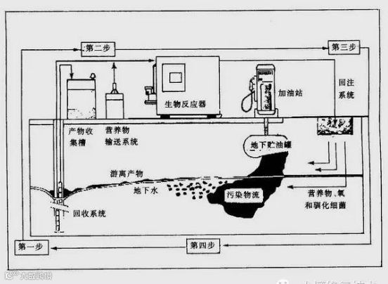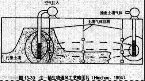 通过空气注气井将空气压入饱和层中,使挥发性污染物随气流进入不饱和层进行生物降解,同时也促进饱和层的生物降解。生物注气法适用于被挥发性有机污染物和燃油污染土壤的处理。空气注气法更适合于处理被小分子有机污染的土壤,对大分子有机物污染的土壤较不适用。