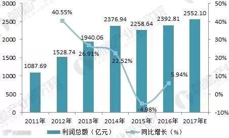 图表4:2011-2017年环保设备行业利润总额变化情况(单位:亿元,%)