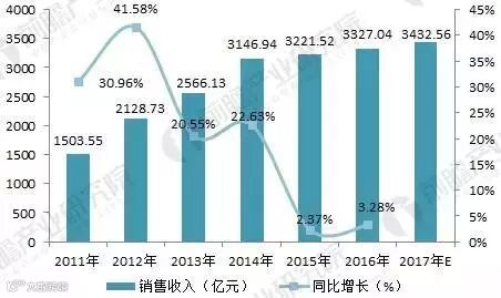 图表3:2011-2017年环保设备行业销售收入变化情况(单位:亿元,%)