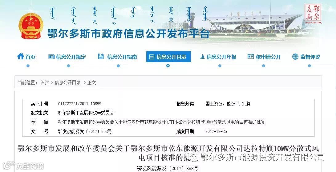 2017年12月25日,能源公司下属全资子公司鄂尔多斯市乾东能源开发有限公司达拉特旗10MW分散式风电项目喜获市发展和改革委员会的核准批复,为项目争取到2017年陆上风电补贴电价0.47元/kwh,成功抢抓利润4000余万元。