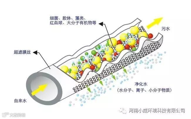 超滤(UltraFiltration,简称UF)是溶液在压力作用下,溶剂与部分低分子量溶质穿过膜上微孔到达膜的另一侧,而高分子溶质或其他乳化胶束团被截留,实现从溶液中分离的目的。其截留机理主要是筛分作用,但有时膜表面的化学特性(膜的静电作用)也起着截留作用。超滤分离时是在对料液施加一定压力后,高分子物质、胶体物质因膜表面及微孔的一次吸附,在孔内被阻塞而截留及膜表面的机械筛分作用等三种方式被超滤膜阻止,而水、无机盐及低分子物质透过膜。