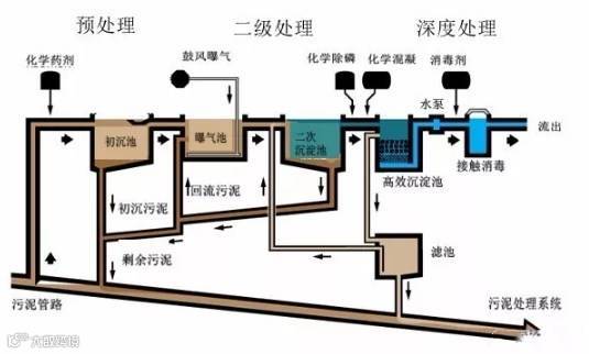 围绕这个目的,污水厂需要建设合理的污泥处理的设施,选用合理的污泥处理设备,对污水处理过程中产生的污泥进行处理,以达到减少二次污染的目的。为了理解污泥处理的设施设备的选型,我们首先要对污水厂内产生污泥源进行分析。我们来看一个采用活性污泥法的污水厂内产生污泥的环节。