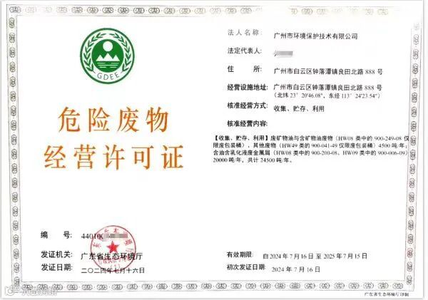 7月16日,广州市环境保护技术有限公司(简称:环保技术公司)金属屑及包装桶资源化项目顺利取得了《危险废物经营许可证》资质。