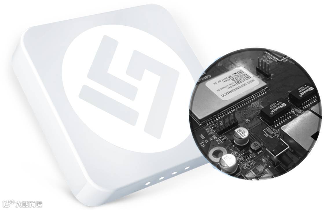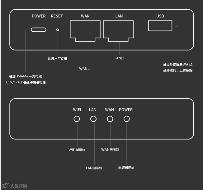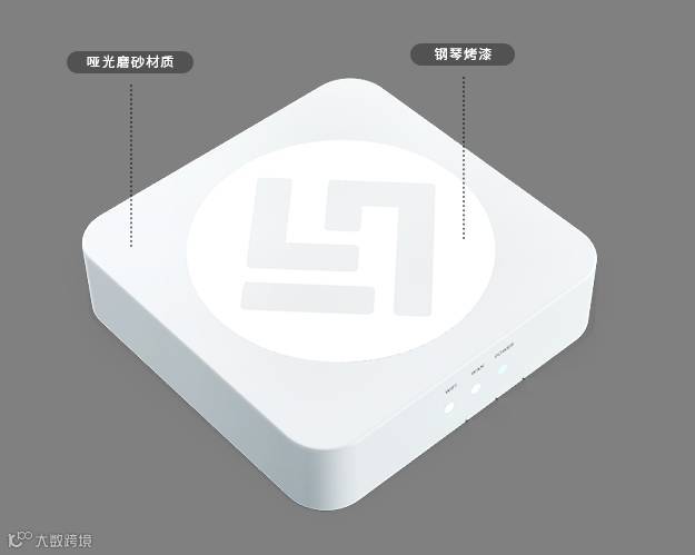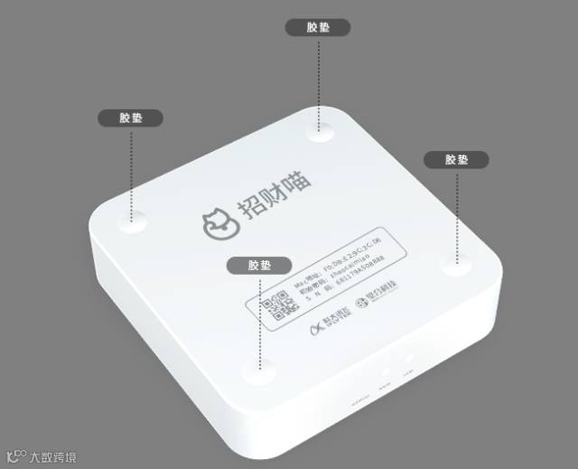 招财喵顶部和底部,分别设有网络接口和指示灯