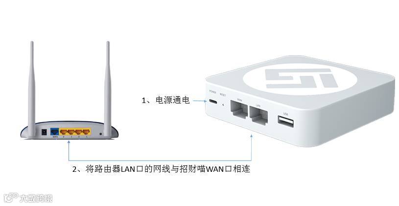 将路由器LAN口的网线与招财喵WAN口相连,确认WAN指示灯亮;