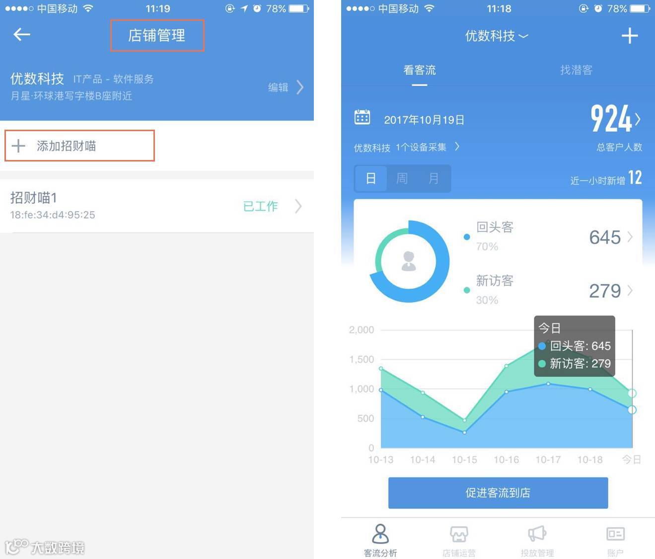 下载招财宝APP,注册登录后,建立店铺,绑定招财喵,等待5分钟后即可查看数据。