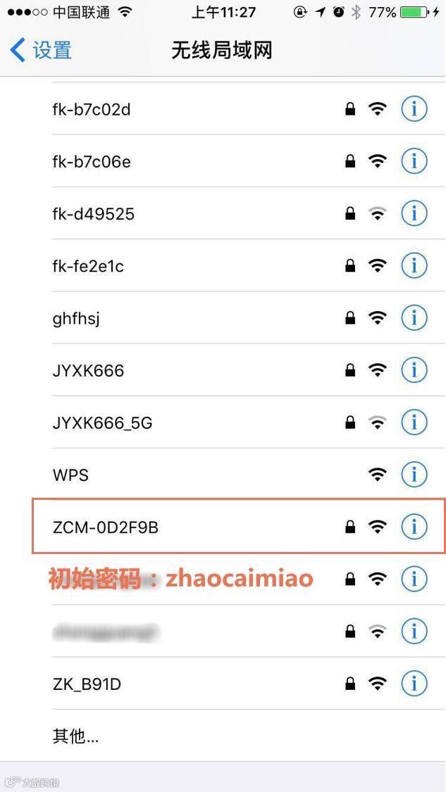 通过电脑(或手机)搜索Wi-Fi,找到无线网络ZCM-******(招财喵背面MAC地址后六位),输入初始密码:zhaocaimiao,进行连接。