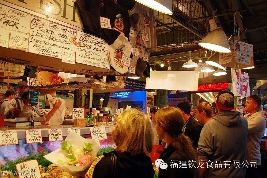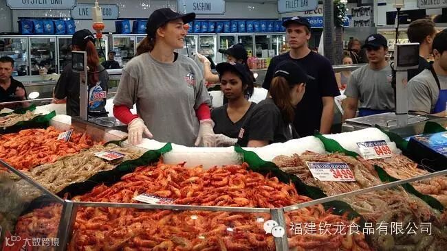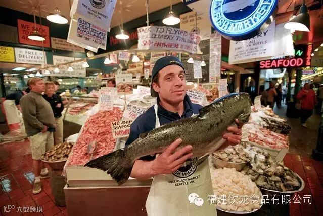 和上述这些本本分分、只讲真材实料的海鲜市场相比,美国人的鱼市显得别出心裁,不得不说,美国人的创意天赋,即使是一个普通的菜场,也能被反映出来。在派克街鱼市上,买鱼和卖鱼的过程就像是一场表演——前台售货员将顾客的需要吆喝着告诉后面的工作人员,后面的工作人员一起重复吆喝一遍,并手脚麻利地把鱼像投篮球一样扔向前台售货员,又快又精彩,美国江湖上号称“飞鱼”。