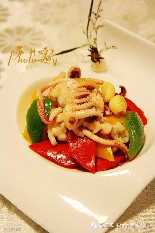 3、将鲜鱿鱼放在青、红、黄彩椒上,加葱丝后放入微波炉以高火加热2分钟,拌匀后即可食用。