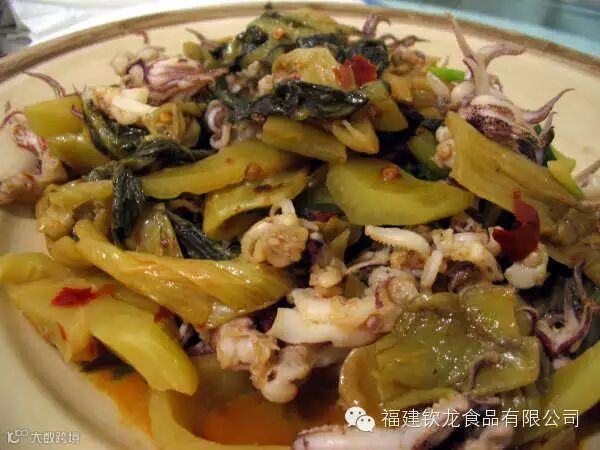 1、鱿鱼剥去外面的膜,洗干净,分成大块;斜切花刀,再改刀成小块;泡酸菜提前浸泡2小时,去部分盐份,洗净切小粒,干锅炒掉水汽;泡辣椒切小段,姜蒜切末,青辣椒和芹菜切段。炒干的酸菜装出备用。