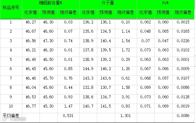从模型的外部验证结果表中可以发现,透明质酸的三种指标的模型进行外部验证的平均偏差都非常小。糖醛酸的含量的平均绝对偏差为0.531%,分子量的平均绝对偏差为1.301,蛋白质含量的平均绝对偏差为0.0086%。通过外部验证的结果,说明模型预测的准确性还是非常好的。