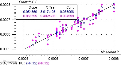 将光谱数据与样品含量数据关联,采用偏最小二乘法(PLS1),用化学计量学软件建立模型。经过异常值的剔除进行逐步优化,最后得到了较为理想的校正模型。