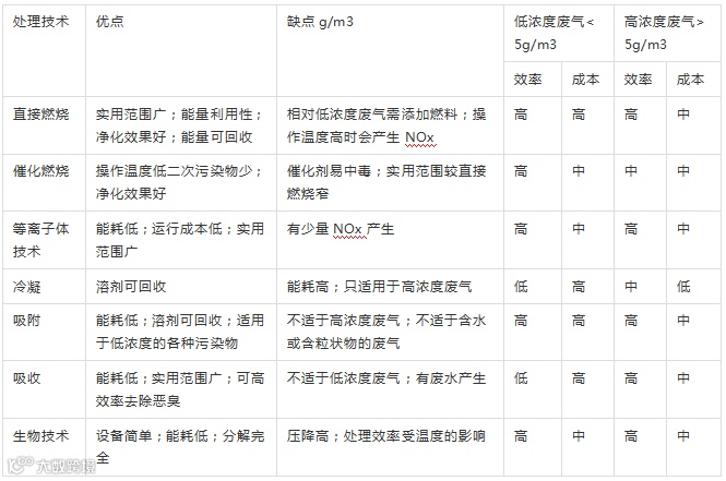采用生物过滤塔,VOCs气体由塔顶进入过滤塔,在流动过程中与已接种挂膜的生物滤料接触而被净化,净化后的气体由塔底排出。该法具有结构简单、投资及操作费用低且处理效果好等优点。常见有机废气的处理技术比较见表1。