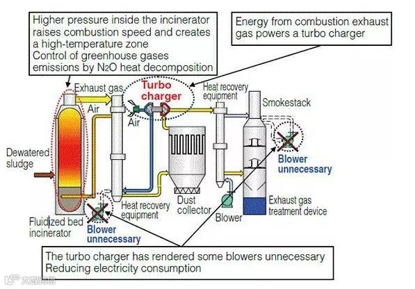 在城市中,污水污泥被焚烧。有必要防止气味问题以及减少体积。如何提高能源效率,减少像N2O这样的温室气体已成为一个主要问题。为此,开发了涡轮焚烧系统。 它减少了40%的用电量,燃料使用量减少了10%,N2O排放减少了50%。